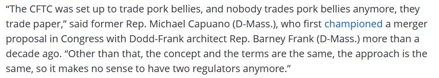 The above is right about the CFTC’s genesis, but it leaves out that CFTC continues to exist mostly so that members on the Senate Ag committee can raise funds by promising opportunities for regulatory arbitrage to financial fraudsters and others introducing novel, risky products.
