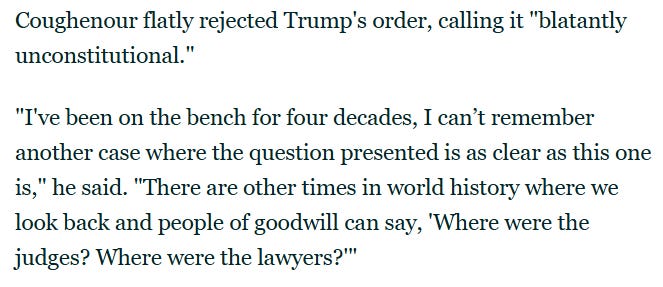 And finally: looking around this week, you may have wondered, “where are the lawyers?” A Reagan-appointed judge had the same thought on Thursday when he took DOJ to task over the President’s order rescinding birthright citizenship: