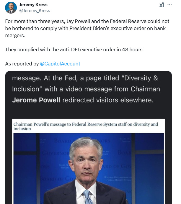 Bank regulators behaving badly: Something something very serious people, adults in the room, central bank independence. Anyway, here’s Michigan Law prof. Jeremy Kress on X: