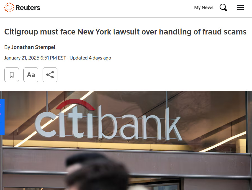 Banks behaving badly (2): New York AG Letitia James gets past Citibank’s motion to dismiss a suit claiming the bank “failed to protect customers from online scammers and refused to reimburse customers who were victimized.”