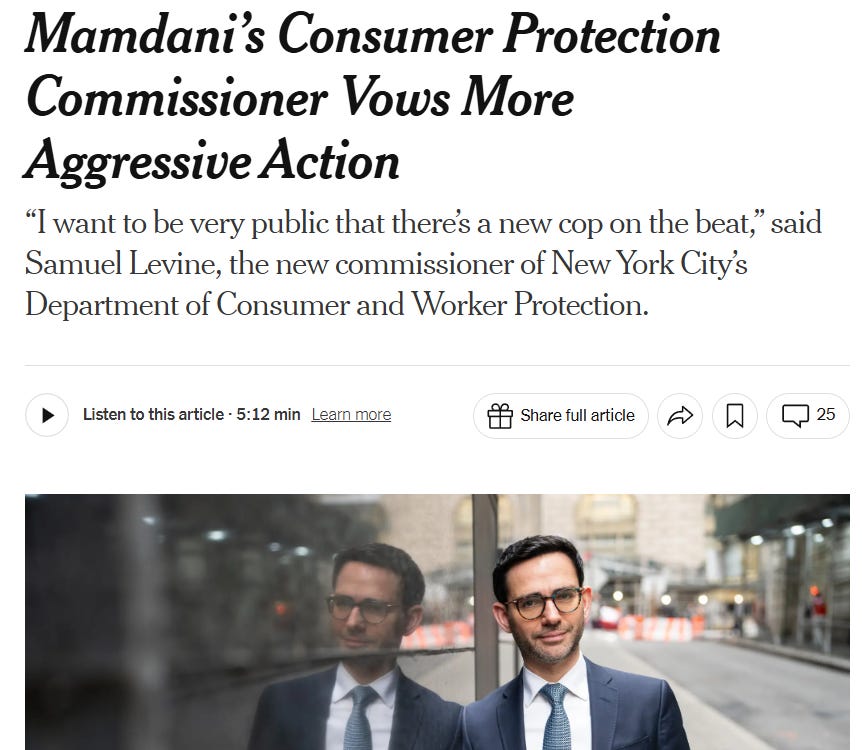 On the state and local front, the Times has a great profile of former FTC Consumer Bureau Commissioner and new NYC Department of Consumer and Worker Protection Commissioner Sam Levine (emphasis added below):