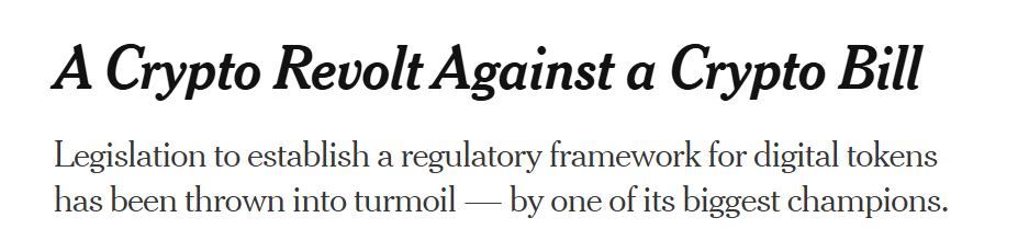 If it isn’t clear yet, I sort of hate writing about crypto. But I described last week how efforts to pass a “crypto market structure” bill were blowing up in the Senate, and this week they fully combusted. At least for now.