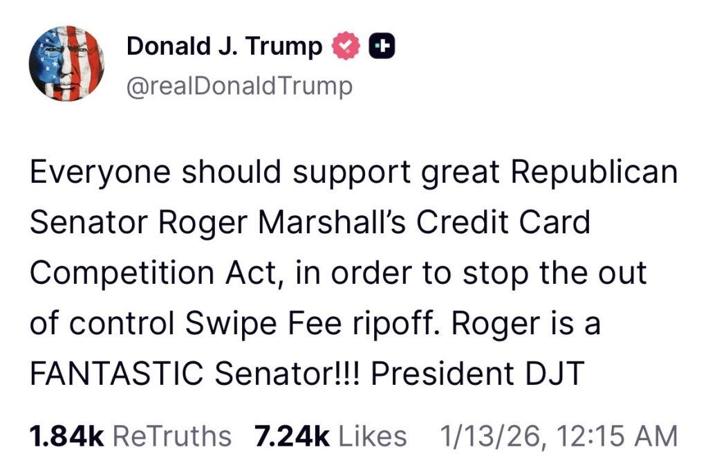 Perhaps more importantly, Trump endorsed Dick Durbin and Roger Marshall’s Credit Card Competition Act (CCCA).