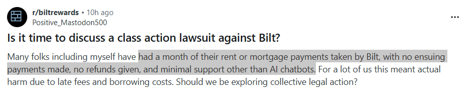 and, perhaps the issue that has driven the most frustration and outrage, issues with rent and mortgage payments not being made, being delayed, or bouncing, with some users reporting their external bank account had been debited by Bilt, but the corresponding payment was never made to their landlord or mortgage servicer.