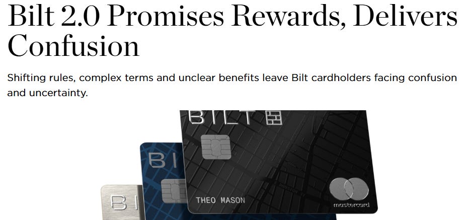 But then Wells killed the partnership, and Bilt had to scramble to rejigger its business model. That’s where things got hairy. Needing to turn the ship around, Bilt released a new slate of cards in January called “Bilt 2.0.” Those cards would be powered by Column Bank, which does a lot of fintech stuff. For our purposes, it suffices to say that The 2.0 cards are less generous than the 1.0’s. Existing Bilt users could keep their account with Wells and get a Wells credit card, or they could move to Bilt 2.0 with Column. If they chose the latter option, Bilt promised the transition would be “seamless.”