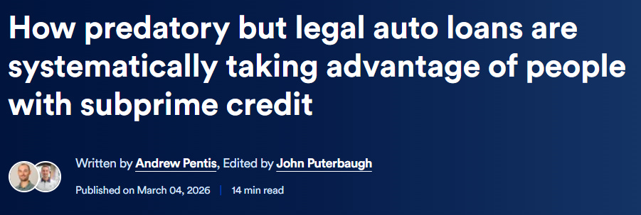 The article goes on to describe how inadequate existing protections are around auto financing, how some states police this area “more aggressively than others,” and how consumers have vanishingly few tools to protect themselves here.